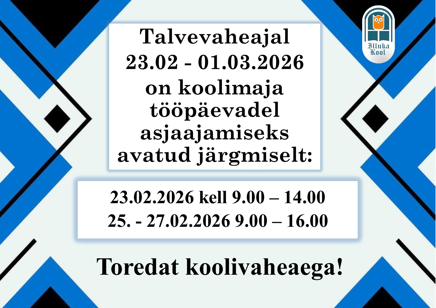 Talvevaheajal 23.02 - 01.03.2026 on koolimaja tööpäevadel asjaajamiseks avatud järgmiselt: