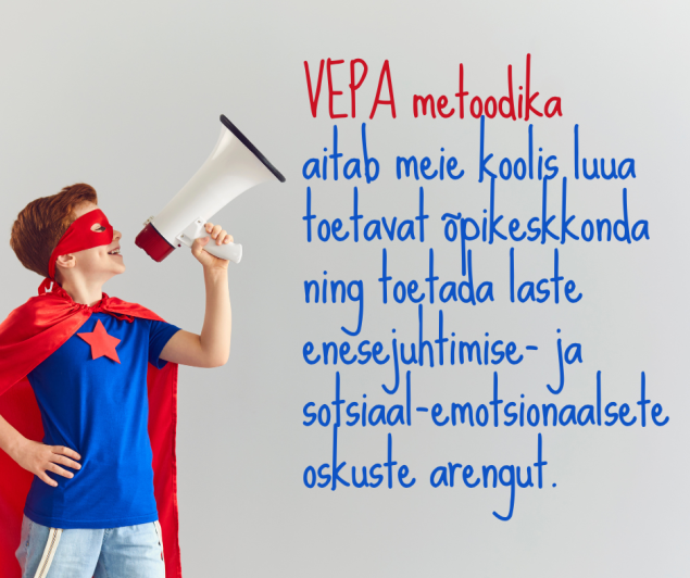 VEPA metoodika on tõenduspõhine ennetustegevus, mida kasutatakse meie koolis 2023. aastast. VEPA on kasutatav algklassides tavapärase õppetöö osana ja metoodika aitab õpetajal lihtsate ning mänguliste klassijuhtimistehnikatega luua toetavat õpikeskkonda ja arendada laste enesejuhtimise- ja sotsiaal-emotsionaalseid oskusi. Enesejuhtimine hõlmab endas keskendumist, sujuvat tähelepanu ümberlülitamist, toimetulekut tugevate tunnetega ja oma käitumise kohandamist vastavalt olukorrale. VEPA puhul on suur rõhk koostööl, üksteise märkamisel ja tunnustamisel, mis toetab laste sotsiaalseid ja emotsionaalseid oskusi ning enesehinnangut.