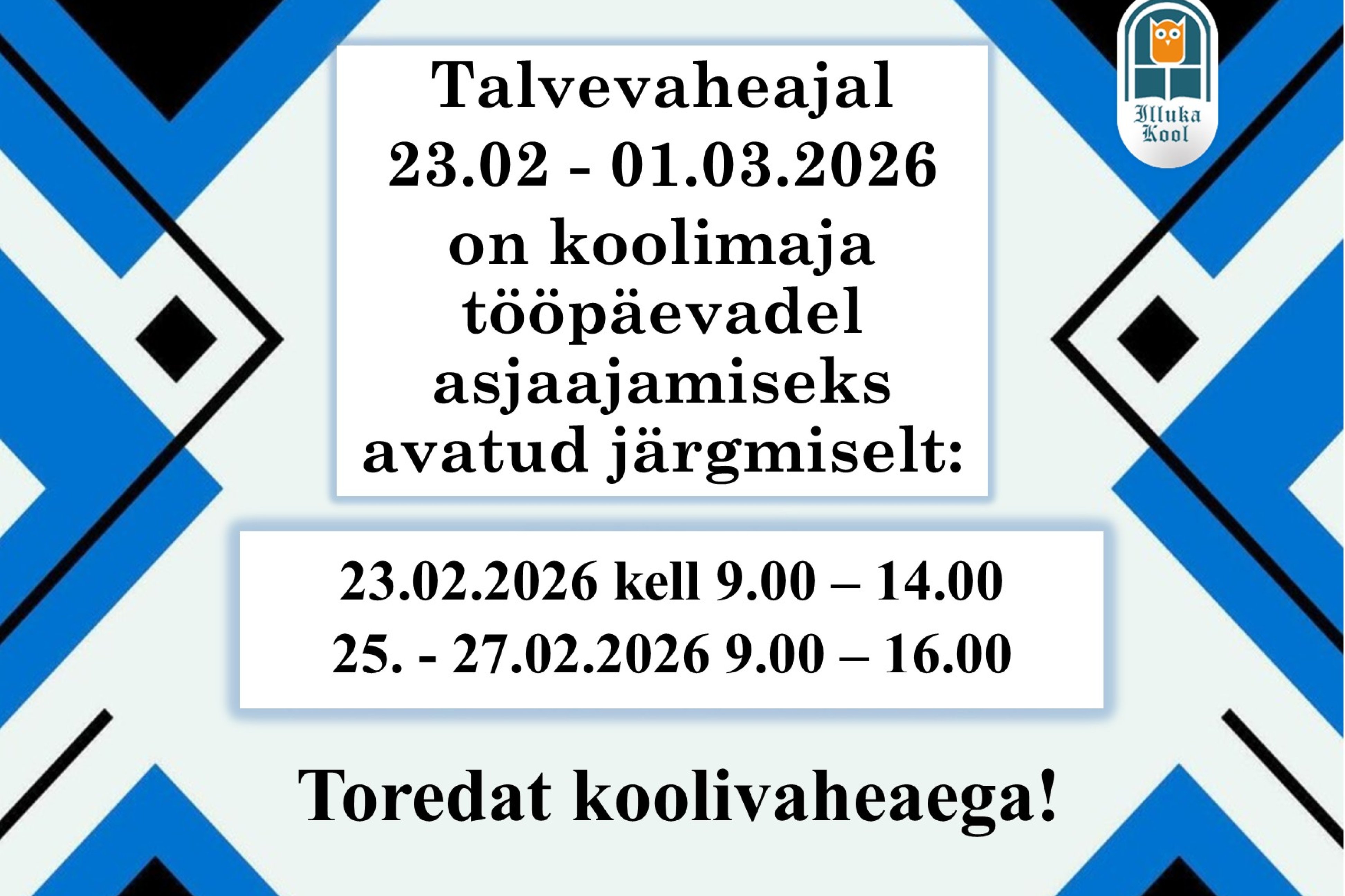 Talvevaheajal 23.02 - 01.03.2026 on koolimaja tööpäevadel asjaajamiseks avatud järgmiselt: